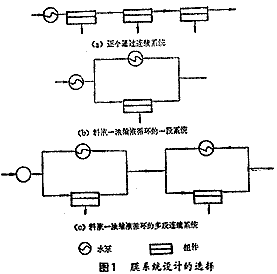 ②膜系統設計的選擇選用 無論是UF膜法或RO膜法,在恒定操作參數下處理造紙廢水時,透水量均隨溶液濃縮倍數的增加而明顯地下降。鑒于膜法這一特征,有幾種不同的設計方案(如圖1所示[2])可供選擇。