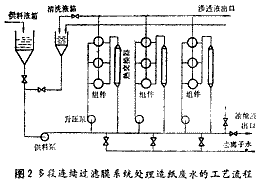 ①膜系統的工藝流程圖2是按照圖1(c)的概念而設計的多段連續過濾膜系統工藝流程的一個便子。