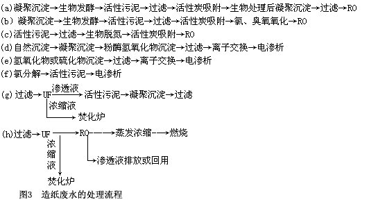 ②造紙廢水處理流程表1已經表明,凝聚沉淀、活性污泥、上浮過濾等常規的處理方法,對于不同的造紙工藝排放的廢水處理一般上都是適用的。但是,欲進行高效的處理,則要結合膜法.圖3給出了一些目前結合膜法使用的處理流程[1,2,4]。